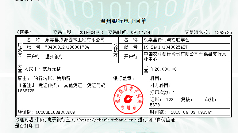 2018向永嘉縣詩詞與楹聯(lián)學(xué)會捐贈2萬元